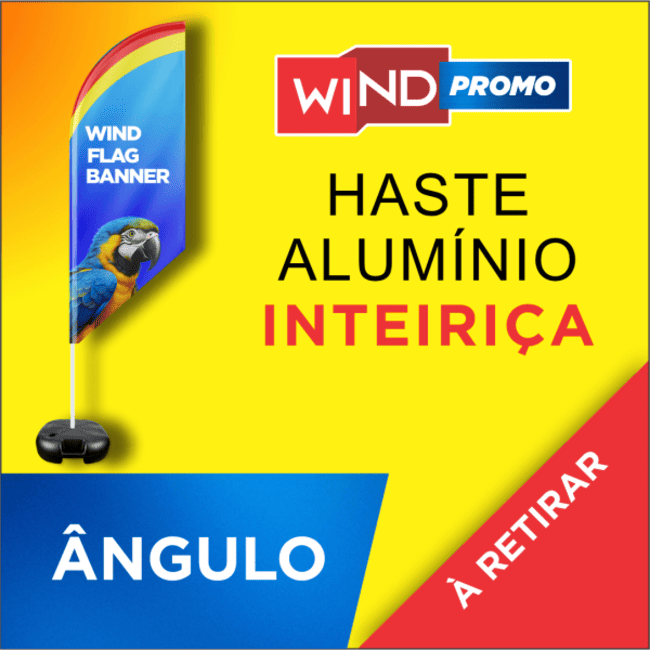 Wind Banner promocional com haste inteiriça e tecido com costura externa, ideal para garantir maior resistência e durabilidade. Perfeito para eventos ao ar livre, feiras e promoções, proporcionando visibilidade e impacto visual. Pedidos acima de 20und